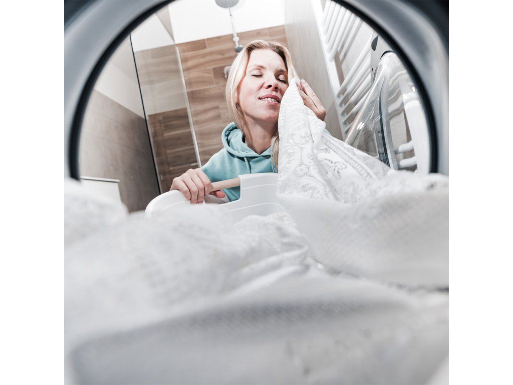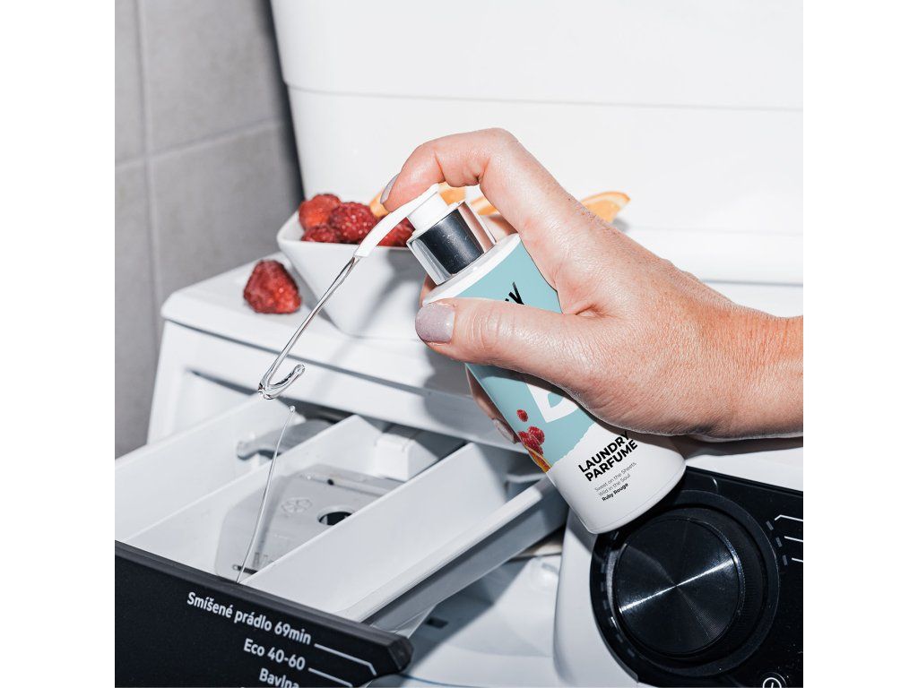 Dozează parfumul în compartimentul pentru balsam de rufe, niciodată direct în tamburul mașinii de spălat sau al uscătorului.